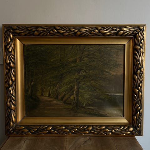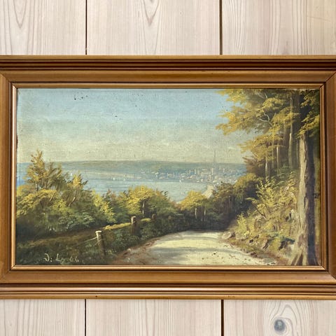 Maleri af ukendt kunstner, signeret i nederste højre hjørne. Motivet viser en borg eller høj bygning omgivet af træer, set fra en vej med hvidt hegn og stengærde i forgrunden. Maleriet er udført i dæmpede naturfarver og er indrammet i en klassisk guldfarvet ramme.
