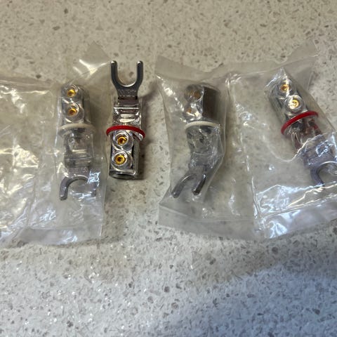 Komplet sæt med 4 stik (2 stk. venstre kanal og 2 stk. højre kanal) til et sæt stereo højttalere.