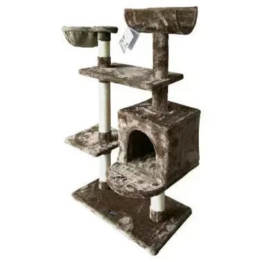 Kradsesøjle og klatremiljø til kat i beige plysstof. Modellen har flere niveauer med platforme, liggeskåle og et rør til gemmeleg. Stolperne er omviklet med sisal til kradsning.