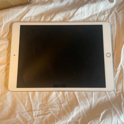 Apple iPad tablet med 64 GB intern hukommelse. Klassisk iPad-model med touchskærm på forsiden og sølvfarvet bagside med Apple-logo. Egnet til brug af apps, internet, streaming og lette opgaver. Understøtter opladning og dataoverførsel via dock-stik i bunden. Fysisk hjemknap på forsiden under skærmen.
