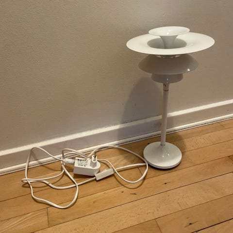 Lampen har indgraveret, geometrisk mønster øverst på foden og hvid fatning til pære. Ledning med stik er monteret i bunden..