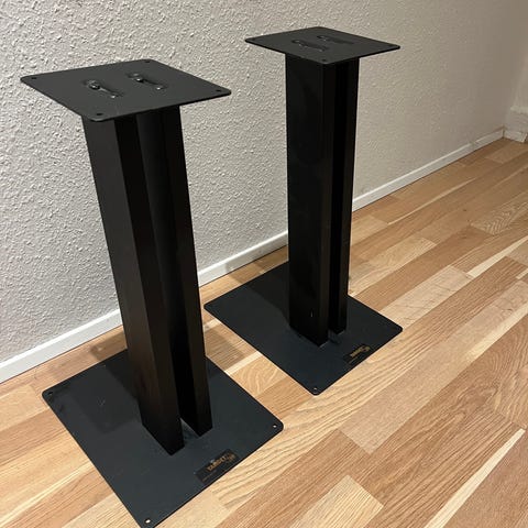 højtalerstativer i sort. Sættet består af to stativer med firkantet topplade og trekantet fod, velegnet til placering af mindre højttalere. Stativerne er beregnet til brug sammen med lydanlæg eller hjemmebiograf, hvor højttalerne ønskes løftet fra gulvet for bedre placering og stabilitet.