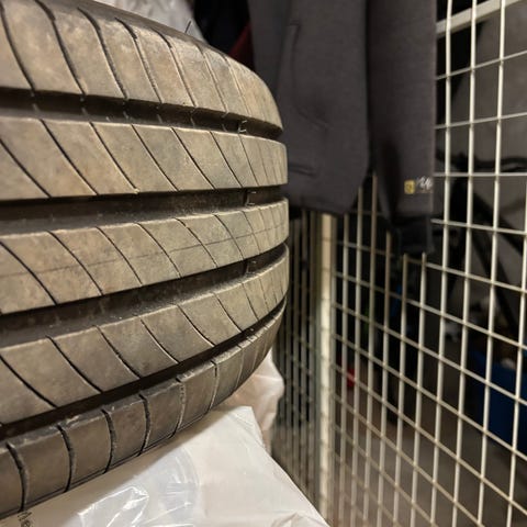 De sad på vores fabriksnye Hyundai Kona Electric 2025, da vi købte den i november 2025 - men blev i forbindelse med handlen udskiftet med helårsdæk.