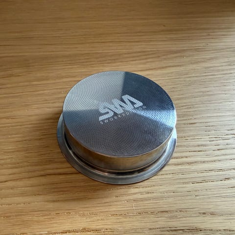 WDT tool fra sworksdesign til espresso. Inklusive holder i poleret stål, også fra sworksdesign. Selve WDT værktøjet er i “rainbow” behandling og har en vild dybde i farven.