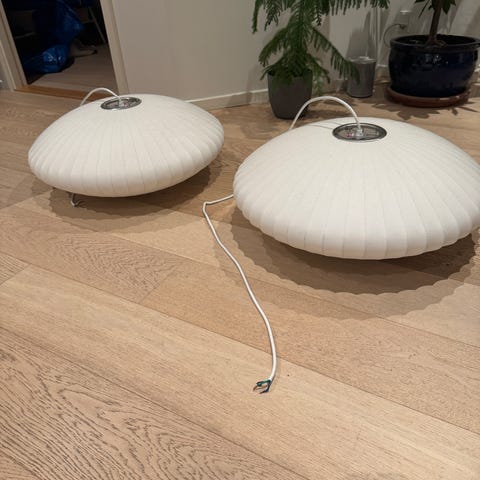 De eftertragtede designerlamper fremstår i rigtig fin stand. Ledningslængde hhv. 190 cm og 290 cm. Ene ledning er forlænget med stik som foto viser. Lampe til venstre har en lillebitte misfarvning som foto viser. Lamperne sælges samlet for 5500,-