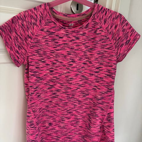 H&M Sport t-shirt til børn i str. 134. Kortærmet model i pink med kontrastfelter i en lysere rosa/orange tone. Velegnet som sportstrøje eller til aktiv hverdagsbrug. Materiale er typisk syntetisk funktionsmateriale fra H&M Sport