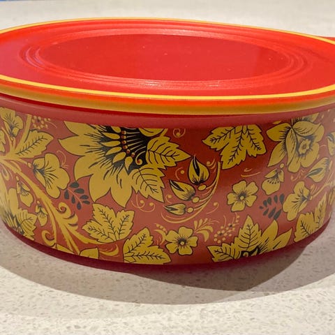 Tupperware madskål i plast med tilhørende låg, bestik og lille beholder. Skålen er i blå transparent plast, mens låg, kniv, gaffel og lille beholder er i blå og gul plast. Låget har integreret holder til bestik og plads til den lille beholder, som kan bruges til fx dressing eller sauce. Velegnet til opbevaring og transport af mad, fx salat, frokost eller rester.