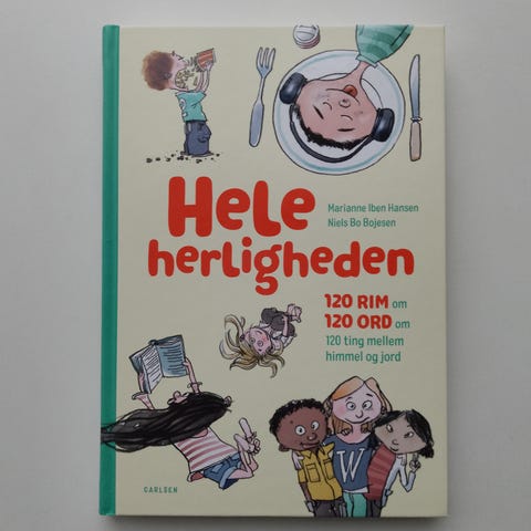 Carlsen Hele herligheden børnebog i hardback-udgave. Bogen indeholder 120 rim og 120 ord med illustrationer til børn. Velegnet som højtlæsningsbog og til sproglig leg for børn. Udgivet på dansk af forlaget Carlsen som illustreret hardback.