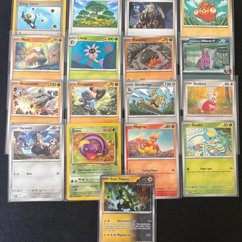 17 blandet Pokémon kort, fra forskellige serier.