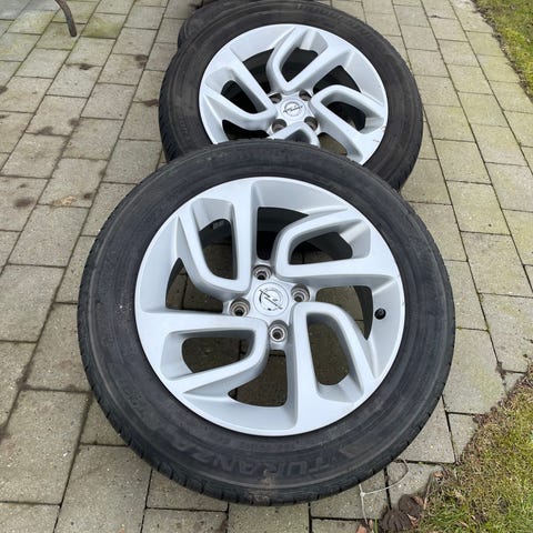 4 originale Opel fælge med gode Bridgestone-dæk og originale Opel hjulkapsler.