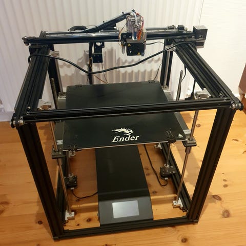 Det er en Ender-3 V2 men jeg har installeret en BLtouch sensor, som går at den automatisk kan level. Der er også et enclosure, som holder printeren varm, så den kan printe med ABS uden problemer. Der er installeret forskellige lyddæmpene sager såsom vibrationdæmpere. Der medfølger også 3 Noctua faner som kan installeres istedet for de faner som printeren kom med, jeg fik det aldrig gjort, fordi støjen var ikke særlig høj.