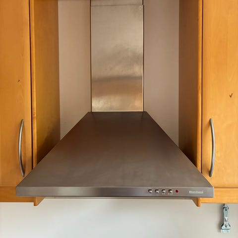 Køkken med skabe, bordplade og emhætte