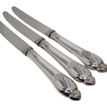 Sølvtøj, Kniv, smørekniv , Evald Nielsen, Flot kniv i sølv. Tretårnet sølv. Art deco. Stemplet. Fra begyndelsen af 1900 tallet. L: 22 cm. Kan sendes efter aftale