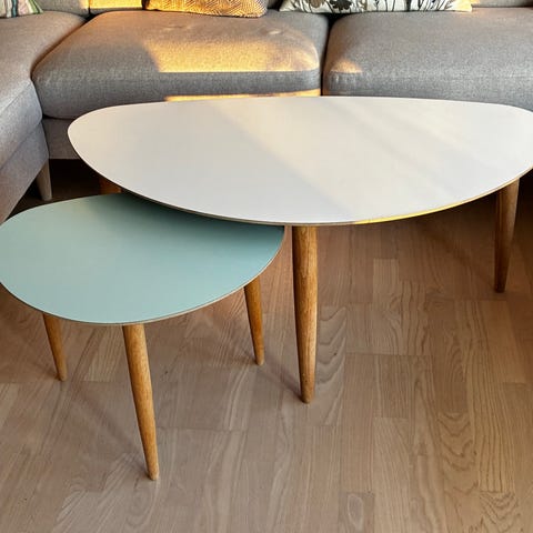 Fint og velholdt trebenet sofabord med grøn bordplade og sorte ben.