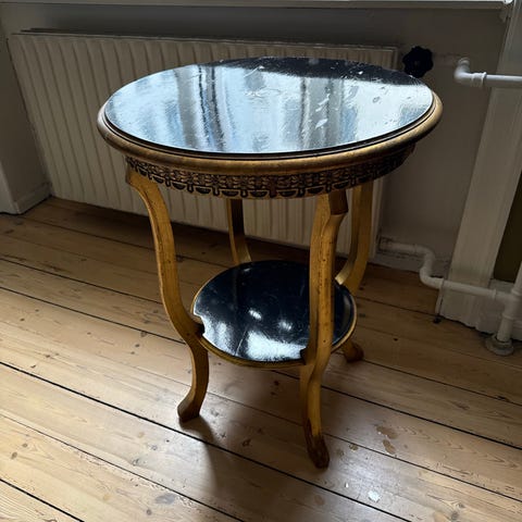 Rund sidebord i mørkt træ med skuffer