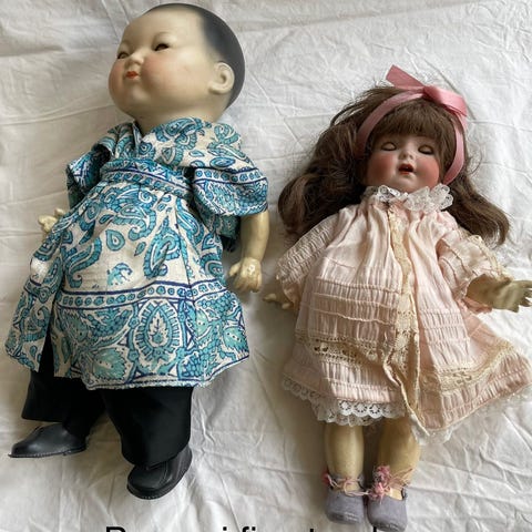 Indeholder stor samling antik og vintage dukke porcelæn, glas, broderede miniature duge, metal bestik og 'sølvplet' lysestage.