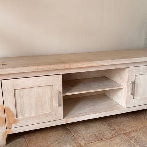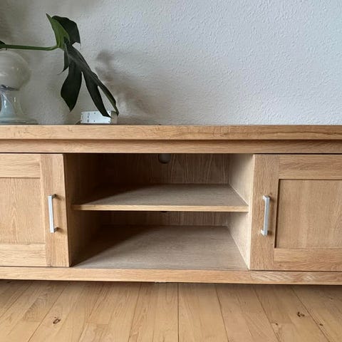 Tv-bord, massiv eg, sæbebehandlet.
