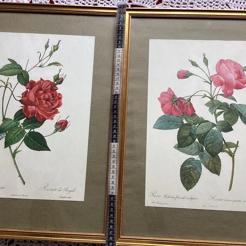 Billedrammer med blomster- og stillebenmotiver i guldfarvet træ. Flere rammer i forskellige størrelser med hvide passepartouter og profilerede guldfarvede trælister. Motiverne forestiller blandt andet frugter og blomster arrangeret som stilleben. Egnede til ophængning samlet eller enkeltvis i stue, gang eller andre opholdsrum.