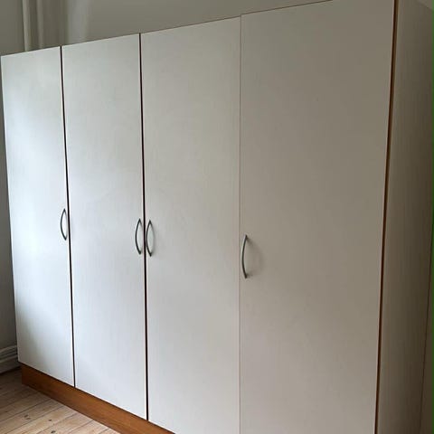 Ukendt brand og designer, købt i 67. Lavet i træ med skydelåger. Skabet fremstår som et større klædeskab med flere sektioner, hylder og bøjlestang til ophæng af tøj. Indretningen omfatter åbne rum, hylder og mindre rum, som kan anvendes til foldet tøj, sko eller tilbehør. Udvendigt har skabet en ensartet træfront med greb integreret i lågerne. Velegnet som garderobeskab i soveværelse eller entré, hvor der er behov for god opbevaringsplads til tøj og tekstiler.