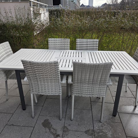 Havebord med udtræk og 8 stole i træ med hynder