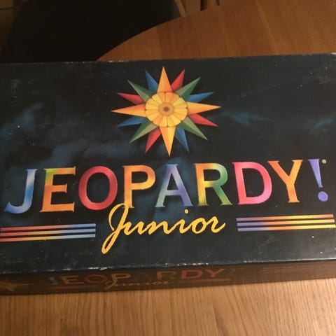 Jeopardy Junior brætspil. Spillet indeholder spilleplade, pointbrikker, kort og spilleregler, som ses på billederne. Velegnet som quiz- og vidensspil til børn og familier.