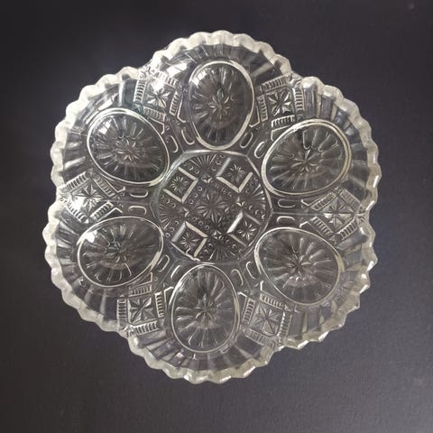 Borddækning. glas fad. Fad i presseglas. anretning. Servering. udstilling. indretning. Presset glas. Smykkeskål. Glasfad til smykker. Antik Glasfad til æg. Serveringsfad i glas. Dansk design. Dansk håndværk. Ægfad. fad til æg. Vintage glasfad til æg. Æggefad i presset glas. Vintage æggefad. Frokostbord. Julebord. Julefrokost. Påskebord. Fad til påskefrokost. Fad til Brunch. Glas is life. Fyens Glasværk æggefad. Kastrup Glasværk æggefad. Antikt æggefad. Glas æggefad 6 æg. Ægfad Fyens Glasværk