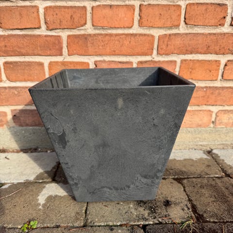 Artstone Ella plantekrukker i sort plast. Modellen er kvadratisk og måler ca. 25 cm i topmål og 24 cm i højde med et rumindhold på ca. 8 liter pr. krukke. Krukkerne har drænhuller i bunden og er egnede til udendørs og indendørs beplantning, f.eks. til blomster, krydderurter eller mindre buske.