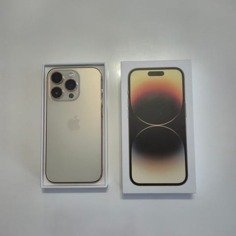 Apple iPhone 14 Pro smartphone med 128 GB intern hukommelse. Modellen har stor skærm med frontkamera i skærmens øverste del og tredobbelt kamera på bagsiden. Perfekt stand, ikke en ridse. Batteri - 82%, stadigvæk nok til hele dagen. Kommer med ESR cover mes indbygget fod og panzerglas på.