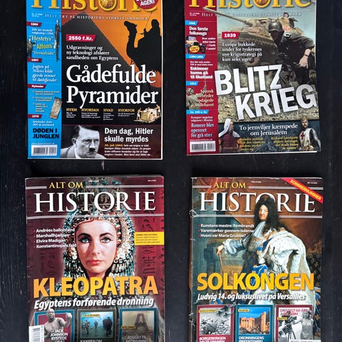 Har disse Alt om Historie magasin samling. Samlingen består af flere numre af magasinet med forskellige historiske temaer på forsiderne. Magasinerne er velegnede til læsere med interesse for verdenshistorie, krigshistorie, politiske begivenheder og kulturhistorie. Indholdet omfatter artikler, illustrationer og fotos, der belyser historiske perioder, personer og begivenheder fra forskellige tidsaldre.