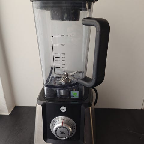 Wilfa blender med firkantet kande i klar plast og sort base. Blenderen har digitalt betjeningspanel med display på fronten, hvor hastighed og tid kan indstilles. På basen er der fire gummifødder/ophæng til kanden. Kanden har låg med åbning samt medfølgende stamper/presser. Materialet på kanden er BPA-fri plast ifølge mærkatet. Blenderen er egnet til almindelige blenderopgaver i køkkenet som fx smoothies, supper, nøddecreme, pesto og isknusning, afhængigt af de tilgængelige programmer og hastighedsindstillinger.