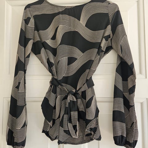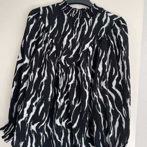 Er lang i kroppen med krøl effekt på skuldre og de trekvart lange ærmer.