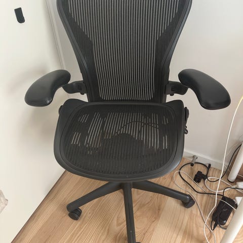 Herman Miller Aeron kontorstol i sort mesh. Stolen har justerbare armlæn, høj ryg og femstjernet fod med hjul. Sæde og ryg er udført i åndbart mesh-materiale, som giver støtte og ventilation ved længere tids brug. Velegnet som ergonomisk arbejdsstol til kontor eller hjemmearbejdsplads.
