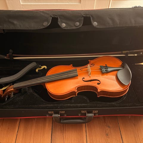 Elektrisk violin med hård kasse. Violinen har slankt, åbent korpus og er egnet til brug med hovedtelefoner eller forstærker. Kassen har formtilpasset indmad og plads til tilbehør som skulderstøtte, bue og andre småting. Velegnet til transport og opbevaring af instrumentet.