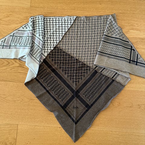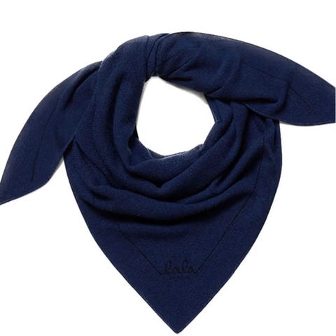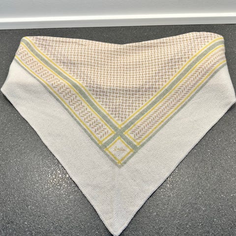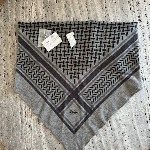 Som vist på billederne. Der er målepind på nogle af billederne. Der er repareret 2 små huller ved "lala" logo'et. Kan ses på et par af billederne. Hullerne er repareret med cashmere garn. Ellers er tørklædet i pæn stand.