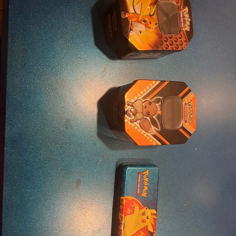 Pokémon metalæsker til samlekort. Sættet består af en større rektangulær tinæske med håndtag og lås samt en mindre, aflange tinæske. Begge æsker har Pokémon Trading Card Game-motiv på ydersiden og er indvendigt i blankt metal uden indsatser. Velegnet til opbevaring og transport af Pokémon-samlekort eller andre små genstande.
