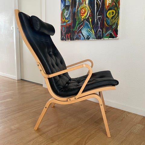 Stolen er i god stand, meget komfortabel og solid. Træramme i bøgetræ og original læderpolstring. Perfekt til stuen eller læsehjørnet.