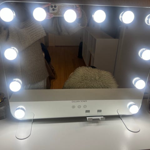 Spejlet har dæmpbart lys og tre lysindstillinger med et tryk på en knap. Den ene pære i højre sider lyser almindeligt i trin nr. 1, lyser ikke i trin nr. 2 og kraftigere i nr. 3. Men derudover fungerer spejlet som nyt. Spejlet har ikke været anvendt, så man kan forvente fuld levetid på ca. 50.000 timer