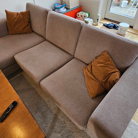 Sofa med chaiselong og hovedstøtter, der kan justeres op og ned. En god sofa til både at sidde i og flyde i.