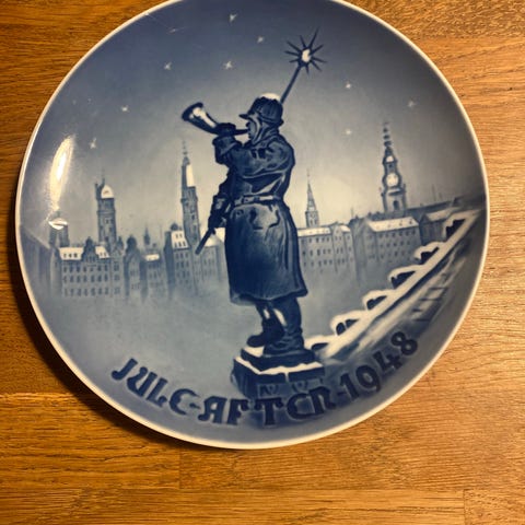 Bing & Grøndahl juleplatter i porcelæn med motiverne "Juleaften 1965" og "Juleaften 1966". Begge tallerkener er udført i blå-hvid dekoration. 1965-platten viser rådyr i skovlandskab med teksten "I skoven for Jul" på bagsiden. 1966-platten viser fiskerbåde på vandet med teksten "Hjem til Jul" på bagsiden. Platterne er mærket "B&G Denmark Made in Denmark" og har ophængshuller på bagsiden, så de kan bruges som vægdekoration eller samlerobjekter.