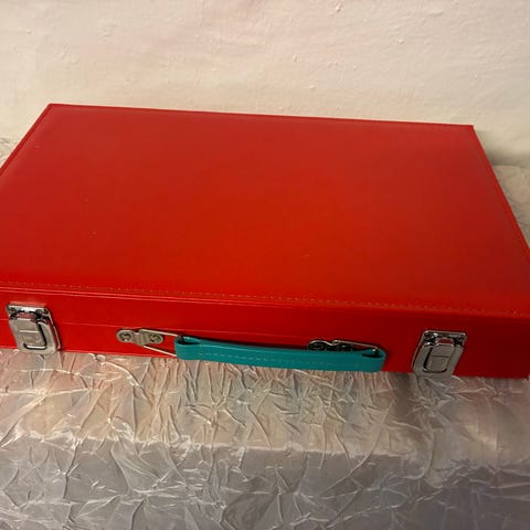 Backgammon træspil med spilleplade i trælook og markeringer i lyse og mørke felter. Sættet indeholder lyse og mørke spillebrikker, terninger samt to raflebægre. Spillepladen er udformet som en kuffert med håndtag, så spillet kan foldes sammen og opbevares samlet. Velegnet til to spillere og kan bruges både hjemme og på farten. Hentes i Brøndby Strand.