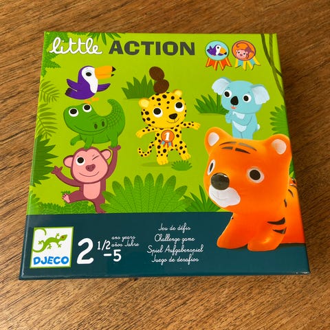 En æske med Mikado spil fra Djeco. Indpakningen er lavet af pap og indeholder flere pinde med farvede markeringer, der anvendes i spillet. Forsiden af æsken viser et kunstnerisk design med en drage. Anbefalet aldersgruppe er 5-10 år. Ideelt til familieunderholdning og at træne finmotorik.