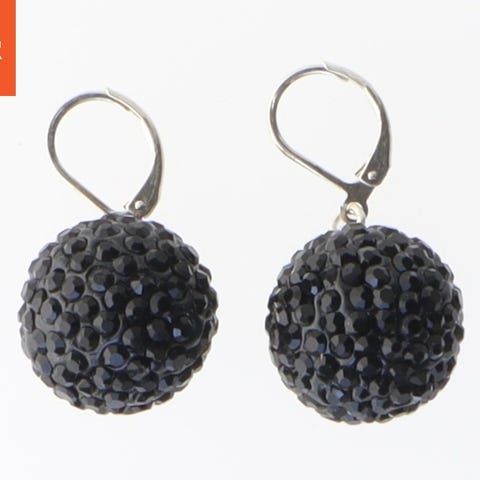 Et sæt glamourøse øreringe med facetterede krystaller i forskellige former og størrelser. Den primære farve er sort, med klare og iriserende krystaller, der giver et luksuriøst udtryk. De er designet til at sidde behageligt på øret og er velegnede til festlige lejligheder. Øreringene måler cirka 4,5 cm i højden.