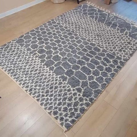 Hvert tæppe er nyt, unikt, lavet af 100% naturlig fåreuld – blødt, stærkt og fuldstændig bæredygtigt. Med sit nutidige mønster giver dette tæppe et frisk syn på det klassiske Berberdesign. Mønsteret og formerne skaber harmoni og sørger for, at dette tæppe ubevidst straks fanger opmærksomheden hos enhver besøgende.