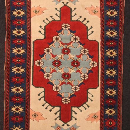 Smukt håndknyttet tæppe af uld. Katoenen er naturligt farvet uden kemikalier. Hovedfarverne er creme, rød og grøn. Tæppet er med smuk, professionel og stram knytning, og det har korte frynser.