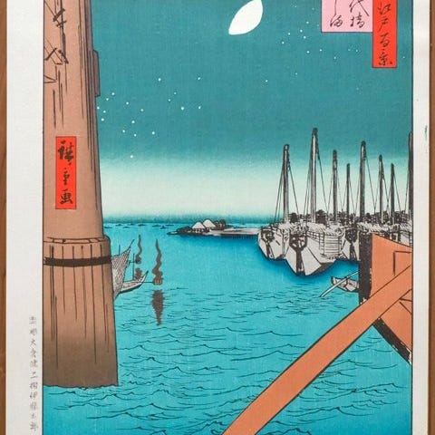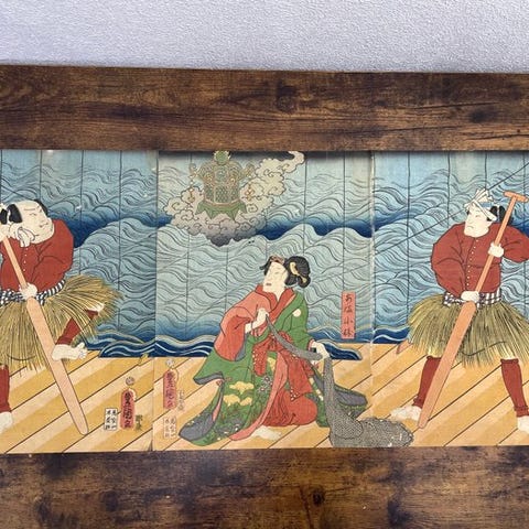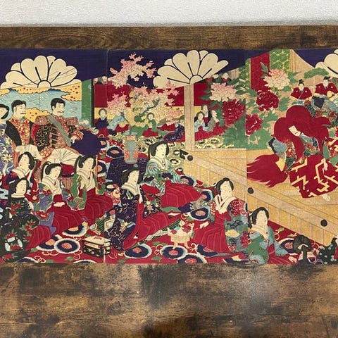Original Meiji-periode Nishiki-e træsnit fra 1877 af Yōshū Chikanobu, kaldet Mitate Shōchiku Ume no Uchi, Shirabe no Itotake, 34 cm × 73 cm, Washi-papir, tre-panel sats, signert av kunstneren, i rimelig stand. Klik på den blå "gå til varen" knap, for at købe eller byde på denne vare. Den samlede pris vil blive vist inden du afgiver dit bud.
