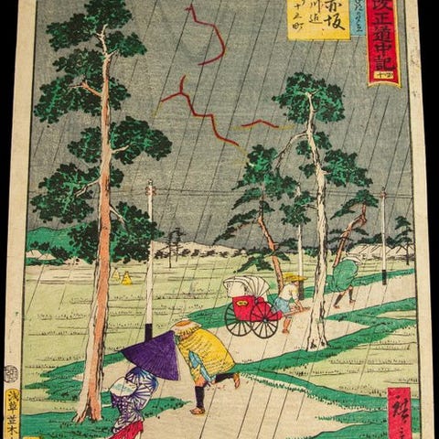 Originaludgave af træsnit af Utagawa Hiroshige fra One Hundred Famous Views of Edo, afbildende Eitai-broen og Tsukuda-øen, udgivet i 1980, med pladesignatur, i god stand; oprindelse Japan, 25,2 × 37,2 cm. Klik på den blå "gå til varen" knap, for at købe eller byde på denne vare. Den samlede pris vil blive vist inden du afgiver dit bud.