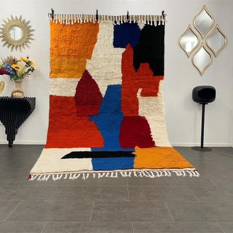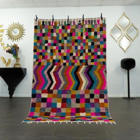 De fængslende mønstre, typiske for Azilal-tæpper, fortæller en rig historie af berbiske symboler, sammensætter skildringer af frugtbarhed og beskyttelseselementer. Den levende farvepalet og de geometriske former, arrangeret både ordnet og spontant, skaber et enestående visuelt udtryk, der tilføjer et ægte og chic