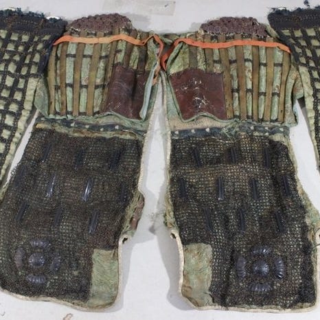 Et moderne, børnevenlig japansk samurai rustningssæt med sort lakeret hjelm, guldcrests og silkelerp, inklusive displaystand og opbevaringskasse, i god stand og ca. 112 cm høj. Klik på den blå "gå til varen" knap, for at købe eller byde på denne vare. Den samlede pris vil blive vist inden du afgiver dit bud.