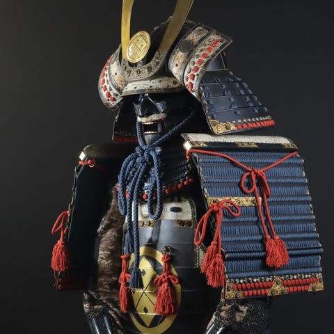 Kabuto - Japan - Børne-størrelses samurai-rustningsæt med sort lakhjelm, gyld...
