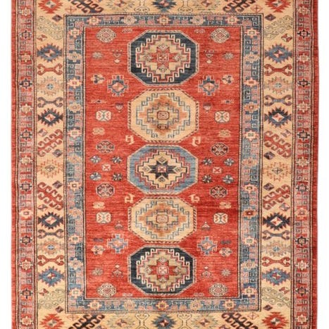 Kazak-teppiche aus Pakistan er håndknyttede tæpper, der oprindeligt er inspireret af de nomadiske stammer i Kaukasus. De er kendetegnet ved deres stærke farver, geometriske mønstre og traditionelle symbolik. Typiske farver er rød, blå og beige, fremstillet af plantebaserede farvestoffer. Teppicherne er fremstillet af høj kvalitet fåreuld, hvilket giver dem en robust og holdbar struktur. Kazak-teppiche er populære både på grund af deres æstetiske skønhed og deres holdbarhed.